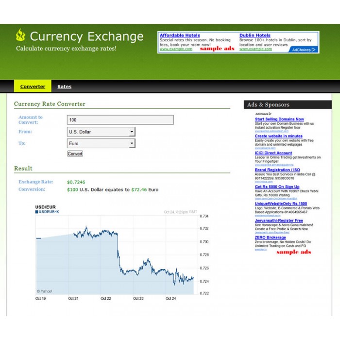 Currency Exchange Converter and Rates is a PHP script which will automatically calculate the exchange rate between two currencies. User enters in an amount, and then a from and to currency. Using the latest exchange rate between the two currencies selected will net you the converted monteary amount. Also, a graph of the exchange rate for the past 5 days is displayed.