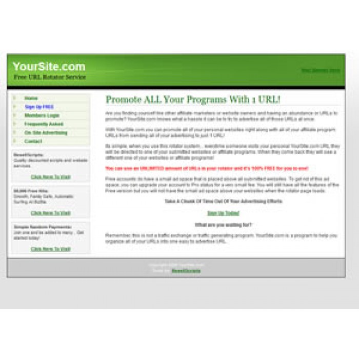 Members of the Rotator Service can login and add an unlimited amount of URLs. Members receive a link to their rotator so they can advertise all of their URLs from one URL. Members can view their statistics, add/edit/delete URLs and more.